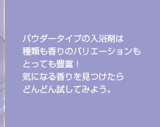 | パウダー(〜100円)|パウダー(100円〜)|パウダー(200円〜)|パウダー(240円〜)|バスソルト(分包) バスバッグ|発泡入浴剤|バスオイル・バスミルク|バブルバス|バスカプセル|花びらの入浴剤 薬用入浴剤|温泉タイプ入浴剤|和風入浴剤|マスコット入浴剤|ランキング |