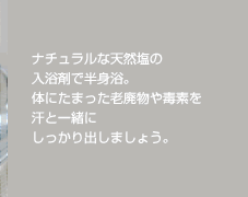 ● ハーバルバスソルト 120円 (税込132円) ![]() 天然塩・オーガニック認証保湿成分 配合バスソルト |