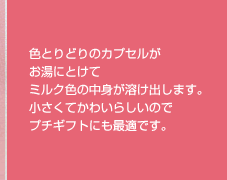 | パウダー(〜100円)|パウダー(100円〜)|パウダー(200円〜)|パウダー(240円〜)|バスソルト(分包) バスバッグ|発泡入浴剤|バスオイル・バスミルク|バブルバス|バスカプセル|花びらの入浴剤 薬用入浴剤|温泉タイプ入浴剤|和風入浴剤|マスコット入浴剤|ランキング |