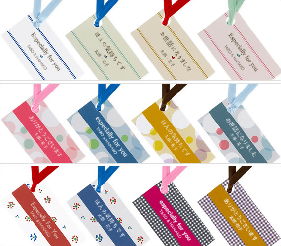 | ごあいさつの文字は 「Especially for you」 「ありがとうございます」 「お世話になりました」 「ほんの気持ちです」 の4種類から選べます。 タグのデザインは▼の12種類から選べます。 |