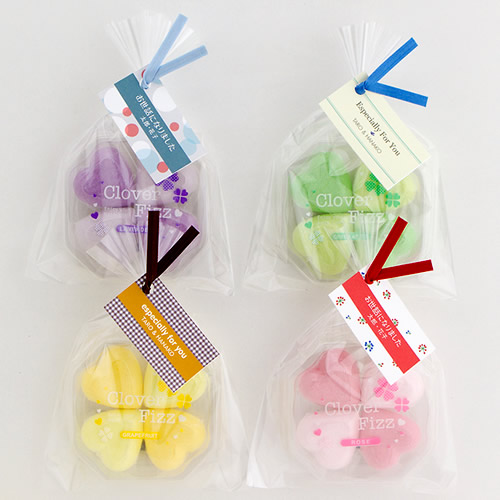 | 小さくてリーズナブルなかわいらしい形の入浴剤はプチギフトにぴったり! でも そのまま渡すのはちょっと? お店や新郎新婦のお名前と、「ありがとう」の言葉を添えたタグを付けるだけで、立派なプチギフトに変身! 結婚式のプチギフトに、季節のイベントに、ご来店記念品に、さまざまなご用途でご利用ください。 |