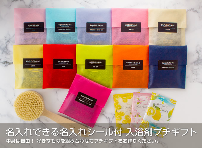 | 不織袋に入浴剤を入れて、名入れができるギフトシールで留めました。 こちらでご用意した内容でしたら、今すぐ買物かごでご注文可能! 中身をカスタマイズしたい場合は、こちらからどうぞ。 |