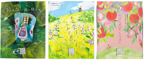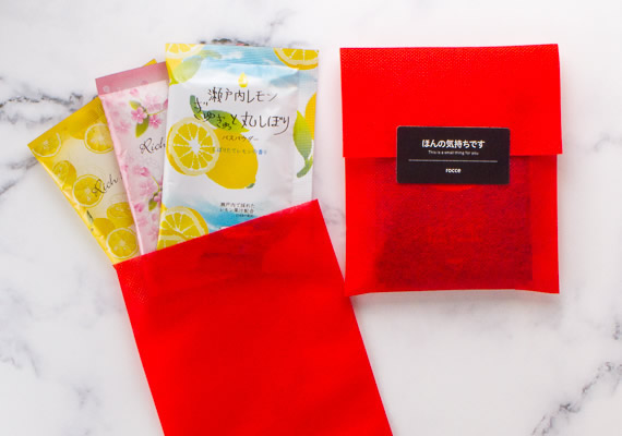 | 不織バッグの中に入浴剤を2個または3個入れて、一言メッセージと名前が入れられるギフトシールで留めてお届けします。入れる種類や数は、変更することも可能です。 中身をカスタマイズしたい場合は、こちらからどうぞ。 |