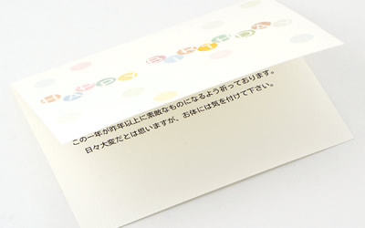 二つ折りカードの 内側に ご指定いただいた メッセージを 印刷します。 ※サイズは はがきサイズを 二つ折りにしたサイズ |