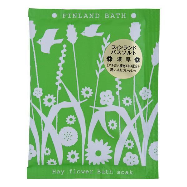 | 美しくきびしい冬、爽やかな汗ふりしぼる夏。 いずれにも濃厚なフィンランドバス。 [ヘイフラワー] 北欧フィンランドの草原を想わせる清清しいヘイフラワー(草花)の香り 無機塩類をベースにハチミツ、アルニカエキス他数種の保湿成分を加えた入浴料です。 発泡粉末入りなので、入浴はじめの数分間はプツプツとした気泡湯が楽しめます。 ミルキーグリーンのお湯。 緑の草原を野生の草花が彩り、北欧の人々が生命力を謳歌する季節。 そんな野原に自生するうさぎ菊(アルニカ)やエルダーフラワー(セイヨウニワトコ)、 マロウ(ゼニアオイ)など数種の植物エキスに蜂蜜を加えたうるおい入浴料です。 |