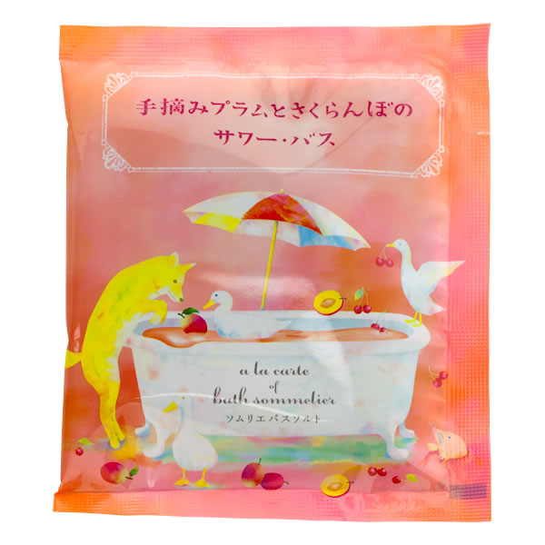 | ようこそ、森の小さな仲間たちお気に入りのクアハウスへ。 ちっちゃなソムリエがおすすめする自慢のレシピがおまちかね。 さてさて本日のアラカルトは・・・ [手摘みプラムとさくらんぼのサワー・バス] 一日中陽射しの下でクタクタになるまで、はしゃぎまわった日には甘酸っぱい プラムとさくらんぼの香りが心地よいサワーバスでさわやかに締めくくるのはいかが? とことこ、アヒルたちが仲良しキツネを誘ってやってきて、 土の中からモグラさんも仲間入り、今夜もおいしくできました。 天然塩にうるおい成分プラム(プルーン分解物)、ローヤルゼリーエキスを混ぜ合わせ、 砂糖(スクロース)を加えました。さくらんぼ果汁を香料に配合しています。 |