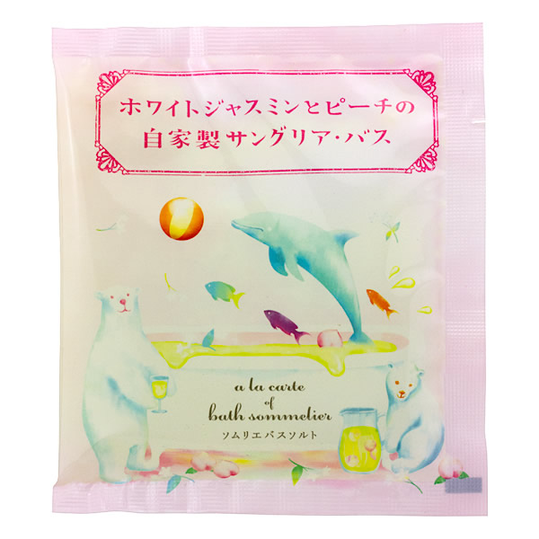 | ようこそ、森の小さな仲間たちお気に入りのクアハウスへ。 ちっちゃなソムリエがおすすめする自慢のレシピがおまちかね。 さてさて本日のアラカルトは・・・ [ホワイトジャスミンとピーチの自家製サングリア・バス] いつもとはちょっと違う特別な一日の始まりに、 モモとジャスミンの爽やかワインカクテルバス「サングリア」のレシピはいかが? はちみつを加えれば、白クマ君自慢の自家製サングリアの出来上がり! フルーティーな香りに誘われたイルカさんやお魚さんたちも「ひとくちちょうだい!」と飛び跳ねます。 天然塩に潤い成分ジャスミン精油、アーモンドオイル、モモ葉エキス、ハチミツを 混ぜ合わせ、ワインを加えました。 |