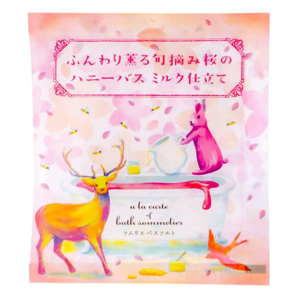 | ようこそ、森の小さな仲間たちお気に入りのクアハウスへ。 ちっちゃなソムリエがおすすめする自慢のレシピがおまちかね。 さてさて本日のアラカルトは・・・ [ふんわり薫る旬摘み桜のハニーバス ミルク仕立て] そよ風にのって、ふわりと薫る桜が心地良い季節には 可憐な花の香りにぴったりなスウィートレシピ、ハチミツとミルクのお風呂はいかが? 桜が満開の樹の下で、今日もお花見バスパーティー。 バンビや小鳥、子ウサギたちも大好きな香りに誘われて仲間入り。 天然塩にうるおい成分ソメイヨシノ葉エキス、ローヤルゼリーエキス、 ハチミツを混ぜ合わせ、スキムミルクを加え仕上げました。 |