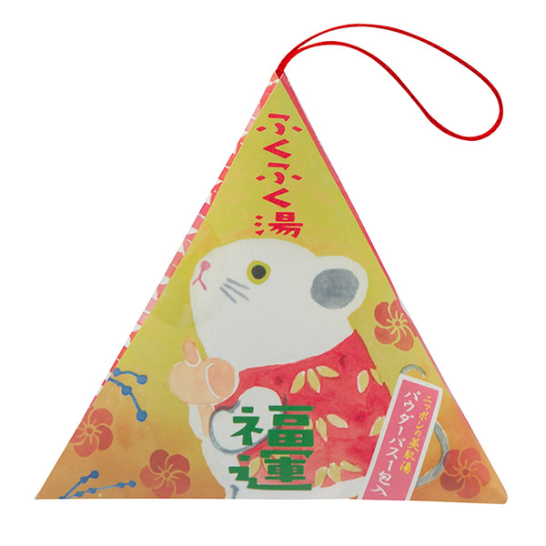 | 縁起の良い、天然由来のうるおい成分入りバスパウダー。 パッケージの中身には縁起物の豆知識が載っています。 [ねずみ(福運)] 縁起の良いあんずのエキス入りで肌のきめを細やかに。 甘酸っぱいあんずの香り 透き通った橙色の湯 |