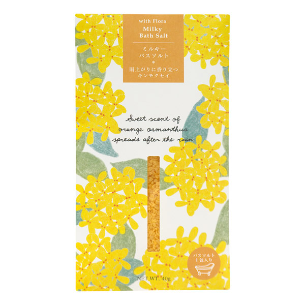 | 季節の訪れを知らせる花々の香りでバスソルトをつくりました。 ふとした瞬間にどこからか漂ってくる花の香り。 それは身近に咲くちいさく可憐な花々から届く季節のたより。 天然由来の植物エキスを配合したバスソルト。 甘く清らかな香りでお肌をしっとりなめらかに保ちます。 バスタイムに花の香りを添えて。 [金木犀(キンモクセイ)] 甘く豊かなキンモクセイの香り。ミルキーイエローの湯色。 【保湿成分配合】モクセイ花エキス |