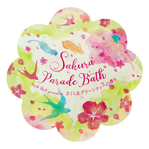 | お花型のパッケージに入った春らしいバスパウダー。 満開のさくらと動物たちのデザインが彩るバスタイム。 [さくら&グリーンティーの香り] クリアグリーンの湯色 |
