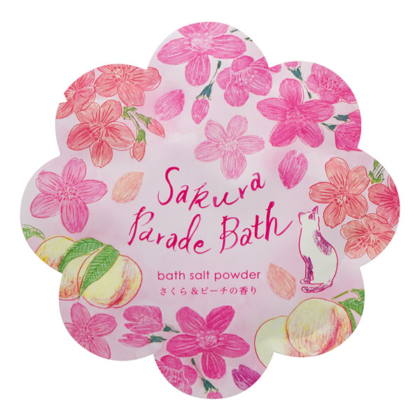 | お花型のパッケージに入った春らしいバスパウダー。 満開のさくらと動物たちのデザインが彩るバスタイム。 [さくら&ピーチ] クリアピンクの湯色 |