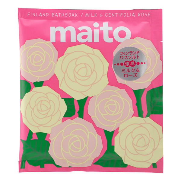 | 心地よい眠りのための濃厚ミルクバス。 おやすみ前に少し贅沢な時間を。 お湯に入れた瞬間、クリーミーな気泡湯が楽しめます。 「maito」はフィンランド語でミルクという意味です。 就寝前にホットミルクを飲むというフィンランドの風習「ナイトミルク」にならい、作りました。 [ミルク&ローズ] 乳桃色のにごり湯 保湿成分:スキムミルク、ダマスクバラ花エキス、センチフォリアバラ花エキス |