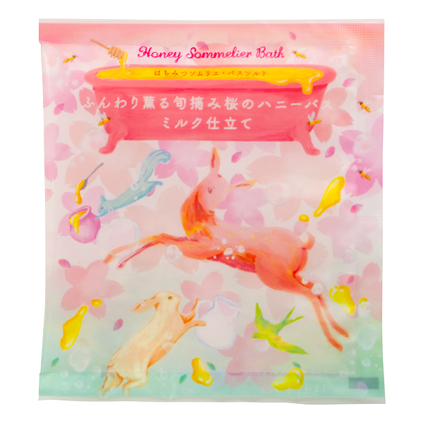 | ここは、静かな森のオーベルジュ。 はちみつソムリエおすすめのレシピで愉しむカクテルバスが自慢の一軒宿です。 さて、今日の日替わりメニューは・・・ [ふんわり薫る旬摘み桜のハニーバス ミルク仕立て] うるおい成分ソメイヨシノ葉エキス、ローヤルゼリーエキス、ハチミツ、スキムミルクを混ぜ合わせ、仕上げました。 〜はちみつソムリエのレシピノート〜 そよかぜにのって、ふわりと薫る桜が心地よい季節には、仕事の合間に中庭のベンチでひとやすみ。 そこでひらめいた季節の限定メニューは、桜の可憐な香りをアクセントに使ったハニーミルクのデザート。 ほんのり甘くやさしい香りは、お花見ディナーのラストを飾るのにぴったりなスウィートレシピ。 桜が満開の樹の下で、どうぞおいしく召し上がれ。 |