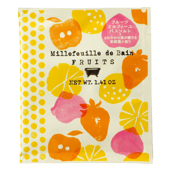 | ■販売元/チャーリー ■ブランド/ミルフィーユ Millefeuille de bain ■内容量/40g ■成分/海塩、オレンジ果実エキス、レモン果実エキス、モモ葉エキス、リンゴ果実エキス、イチゴ果実エキス、ケイ酸Ca、PG、BG、水、エタノール、香料、黄4、黄5 ■原産国/日本 |