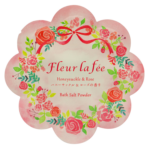 | お花型のパッケージに入ったパウダーバス。 保湿成分ハチミツエキス配合。 心やすらぐお花の香りでささやかなリラックスタイムをお楽しみください。 [ハニーサックル&ローズの香り] クリアレッドの湯色 |