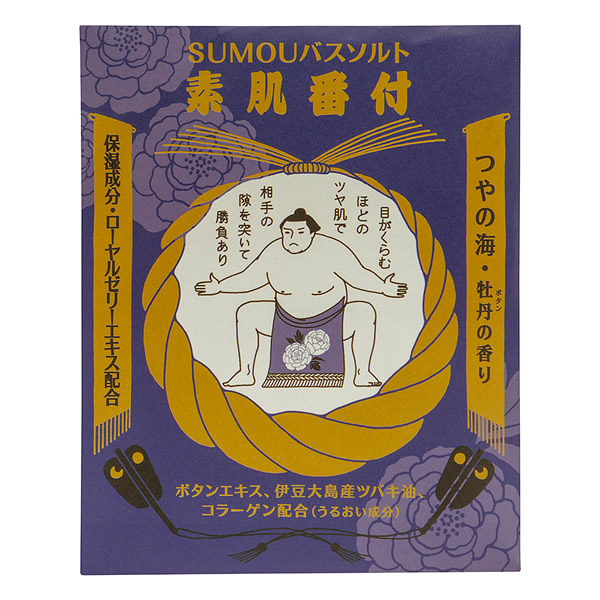 | うるおい成分として力士の髪結いに使われる椿油を配合したバスソルト。 温浴効果で素肌を健やかに。 [つやの海] 目がくらむほどのツヤ肌で相手の隙を突いて勝負あり 牡丹の香り 保湿成分 ローヤルゼリーエキス、ボタンエキス、伊豆大島産ツバキ油、コラーゲン配合 |