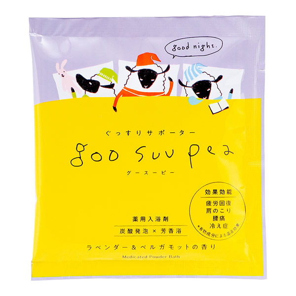 | 毎日の習慣、おやすみ前のゆったりバスタイムがグースーピーたちの快眠の秘訣。 今夜もぐっすりおやすみなさい。 炭酸ソーダをベースにした、パウダータイプの入浴剤。 有効成分が温浴効果を高め、血行促進、新陳代謝を活発に。 【効果・効能】 疲労回復、肩のこり、腰痛、冷え症、にきび、荒れ性、しっしん、あせも、うちみ、くじき、神経痛、リウマチ、ひび、あかぎれ、痔、しもやけ [ラベンダー&ベルガモット] 忙しかった一日は、疲れや肩のこりをやわらげ(温浴効果)、しっとりうるおい肌(保湿成分)で眠りにつきましょう。 芯までぽかぽか ラベンダー色のにごり湯 ふんわり微発泡タイプ 天然うるおい成分 ラベンダー精油/ローズマリー精油/オーガニックホホバ油 配合 香料としてオレンジ果皮油を配合 美肌サポート保湿成分 海藻エキス、高知県室戸沖の海洋深層水(海水乾燥物)をブレンド |