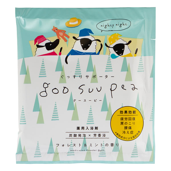 | 毎日の習慣、おやすみ前のゆったりバスタイムがグースーピーたちの快眠の秘訣。 今夜もぐっすりおやすみなさい。 炭酸ソーダをベースにした、パウダータイプの入浴剤。 有効成分が温浴効果を高め、血行促進、新陳代謝を活発に。 【効果・効能】 疲労回復、肩のこり、腰痛、冷え症、にきび、荒れ性、しっしん、あせも、うちみ、くじき、神経痛、リウマチ、ひび、あかぎれ、痔、しもやけ [フォレスト&ミント] ねぐるしい夜には、清涼な香りのお風呂でふぅーっと深呼吸。 一日の疲れや肩こりをやわらげて、眠りにつきましょう。 すっきり芳香浴 ライトグリーンのにごり湯 ふんわり微発泡タイプ 香料としてハッカ油を配合 天然うるおい成分 ラベンダー精油/ローズマリー精油/オーガニックホホバ油 配合 香料として、ユーカリ油、サイプレス精油を配合 美肌サポート保湿成分 海藻エキス、高知県室戸沖の海洋深層水(海水乾燥物)をブレンド |