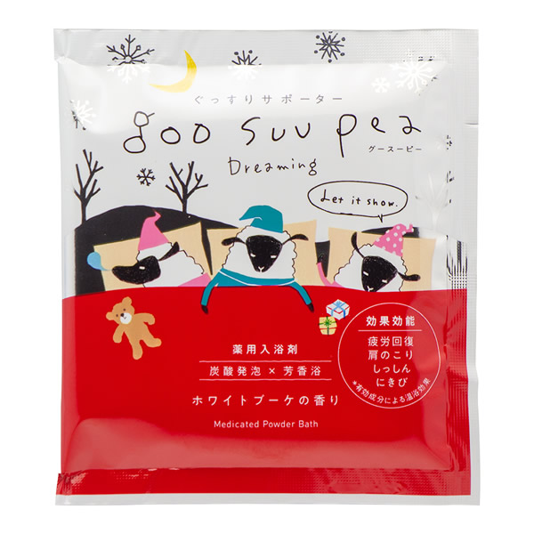 | 毎日の習慣、おやすみ前のゆったりバスタイムがグースーピーたちの快眠の秘訣。 今夜もぐっすりおやすみなさい。 炭酸ソーダをベースにした、パウダータイプの入浴剤。 有効成分が温浴効果を高め、血行促進、新陳代謝を活発に。 【効果・効能】 疲労回復、肩のこり、腰痛、冷え症、にきび、荒れ性、しっしん、あせも、うちみ、くじき、神経痛、リウマチ、ひび、あかぎれ、痔、しもやけ [ホワイトブーケ] ワクワク楽しみな明日にそなえ、疲労回復。 しっとりやわらか肌で眠りにつきましょう。 ふんわり炭酸発泡 微細な泡がなめらかに広がる ベビーピンクのにごり湯 天然うるおい成分 ラベンダー精油/ローズマリー精油/オーガニックホホバ油 配合 イランイラン油、サンダルウッド油を香料としてブレンド 美肌サポート保湿成分 海藻エキス、高知県室戸沖の海洋深層水(海水乾燥物)をブレンド |