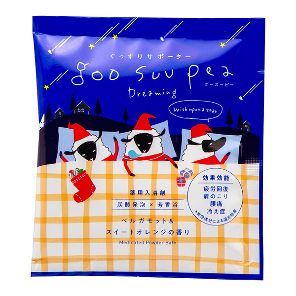 | 毎日の習慣、おやすみ前のゆったりバスタイムがグースーピーたちの快眠の秘訣。 今夜もぐっすりおやすみなさい。 炭酸ソーダをベースにした、パウダータイプの入浴剤。 有効成分が温浴効果を高め、血行促進、新陳代謝を活発に。 【効果・効能】 疲労回復、肩のこり、腰痛、冷え症、にきび、荒れ性、しっしん、あせも、うちみ、くじき、神経痛、リウマチ、ひび、あかぎれ、痔、しもやけ [ベルガモット&スイートオレンジ] 楽しかった一日の終わり、芯までぽかぽかバスタイム。 疲れをやわらげて眠りにつきましょう。 なめらか炭酸発泡 ふんわり微細な泡が広がるライトオレンジのにごり湯 天然うるおい成分 グレープフルーツエキス/オレンジ油/オーガニックホホバ油 配合 ベルガモット油、ティーツリー油を香料としてブレンド 美肌サポート保湿成分 海藻エキス、高知県室戸沖の海洋深層水(海水乾燥物)をブレンド |