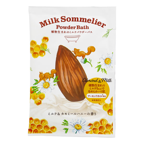 | うるおい成分豆乳パウダーに植物由来の保湿成分を配合したパウダーバス。 湯面に気泡が広がるクリーミーなお湯質で、入浴後はしっとりとした素肌に。 [アーモンド] ここはミルクソムリエ特性のレシピが自慢のバスルーム。 本日のおすすめは『ほんのり甘いミルクとカモミールハニーの香りが愉しめるパウダーバス』 素肌にやさしいうるおい成分豆乳末に、森の人気者リスたちも大好きな木の実から採ったアーモンドオイルを混ぜ合わせ、カミツレ花エキス、ハチミツ、ローヤルゼリーエキスを加え仕上げました。 湯上りはハリのあるなめらか肌に。 ミルク&カモミールハニーの香り ミルキーイエローの湯色 |