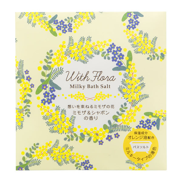 | やわらかい陽ざしを浴びて、枝先から溢れるように花を咲かせるミモザ。 ほんのり甘く軽やかな香りが広がります。 海塩に植物由来のうるおい成分を加えたバスソルトで、湯上りはしっとりなめらか。 保湿成分・アルニカ花エキス、オレンジ油配合 ミルキーイエローの湯色 |