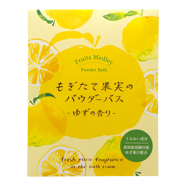 | 季節ごとに、旬を迎える果実の香りをぎゅっと閉じ込めたパウダーバス [ゆず] 重曹ベースのパウダーバスに、高知県・馬路村産ユズ果汁(うるおい成分)を加え、 しっとりとした使い心地に仕上げました。 さわやかな柚子の香り クリアオレンジの湯色 |