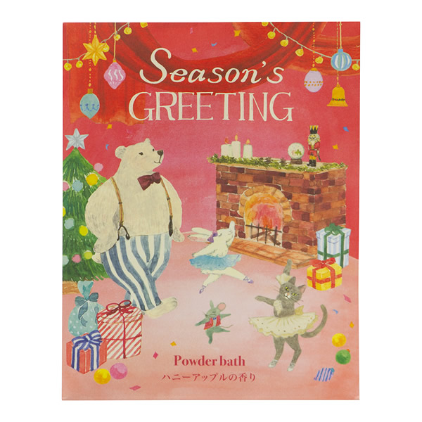 | クリスマスを祝う動物たちが描かれたパウダーバス。 [レッド(ハニーアップル)] 重曹ベースのパウダーバスに、天然果実由来のうるおい成分 リンボ果実エキス、キイチゴエキスを配合。 湯上りはしっとりなめらか肌に。 |