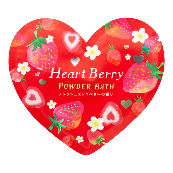 | ハート型のパッケージに入ったうるおい成分ハチミツエキス配合のパウダーバス。 甘酸っぱいベリーの香りが広がります。 [フレッシュストロベリー] クリアレッドの湯色 |
