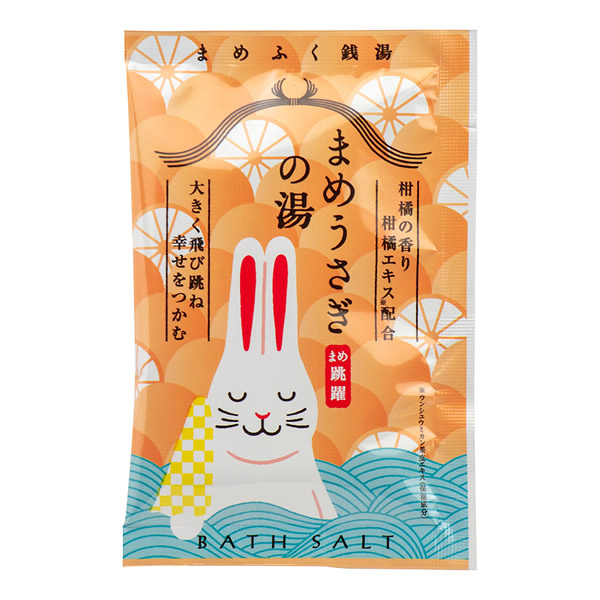 | ちっちゃくて愛らしい縁起物たちがおでむかえ。 お湯につかってぽかぽか、ほっこり気分。 [まめうさぎの湯(跳躍)] 〜大きく飛び跳ね 幸せをつかむ〜 邪気を払うと言われる塩をベースに うるおい成分酒粕エキスと蜜柑エキスを配合したバスソルト。 蜜柑は「代々(橙)栄える」という言葉に掛け、 長寿や子孫繁栄を象徴する縁起物です。 柑橘の香り クリアオレンジの湯色 |