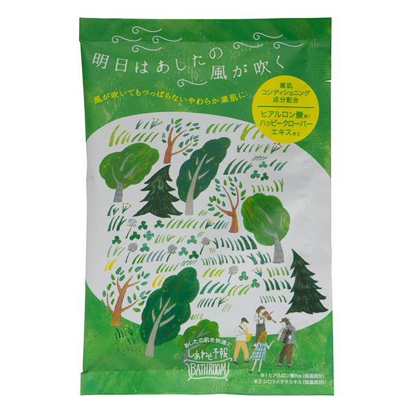| 毎日を心地よく過ごすため、その日の天気に合わせて素肌のコンディションを整えるパウダーバス。 [明日はあしたの風が吹く] 森を吹き抜ける風のように爽やかなウィンディフォレストの香り フレッシュグリーンの湯色 ●素肌コンディショニング成分配合 ヒアルロン酸、ハッピークローバーエキス(シロツメクサエキス) ●天然由来うるおい成分配合 ヒノキチオール、イタリアイトスギ油 〜湯上がり肌をなめらかに〜 |