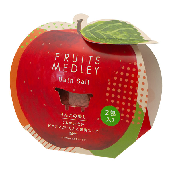 | フレッシュな果実の香りをギュッと閉じ込めたバスソルト [りんごの香り] フレッシュなリンゴの香りをぎゅっと閉じ込めたバスソルト ●うるおい成分 ビタミンC(アスコルビルグルコシド)・りんご果実エキス配合で、湯上りはなめらか素肌に。 ●りんごの香りがバスルームに広がり、気分リラックス ●あたたかみのあるクリアレッドの湯色 |