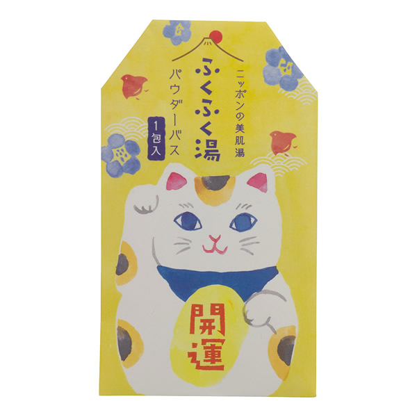 | 縁起の良い、うるおい成分入りバスパウダー。 パッケージの中身には縁起物の豆知識が載っています。 [招き猫(開運)] さっぱりとした柑橘の香り・透き通った山吹色の湯 うるおい成分ゆずエキス配合で肌のきめを細やかに。 ゆずは、長い年月をかけて実がなるための長寿の果樹と呼ばれ、縁起がよいといわれています。 |