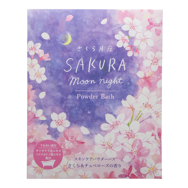 | 月夜に舞う幻想的なさくらをイメージしたパウダーバス。 さくら&チュベローズ(月下香)の香り 優しいミルキーピンクの湯色 ●3種の天然保湿成分配合 サトザクラ花エキス、ソメイヨシノ葉エキス、酒粕エキス ●3種の素肌コンディショニング成分配合 ヒアルロン酸Na、セラミドAP、セラミドNP 〜うるおいを与え、みずみずしい素肌に〜 |
