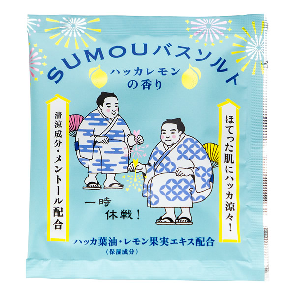 | 日々の稽古で切磋琢磨し風呂で汗を流す。 肌活稽古に励む姿をイメージしたバスソルトです。 [ハッカレモンの香り(一時休戦)] 澄んだ青色の湯 清涼成分メントールと4種の保湿成分配合 ショウブ根エキス・ハッカ葉油・レモン果実エキス・ゲルマニウム |