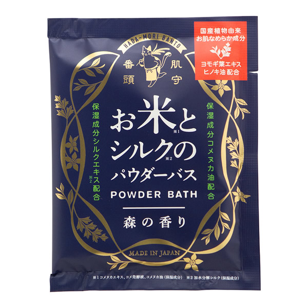 | 国産塩にお米とシルクのうるおい成分と 国産植物由来の保湿成分を加えたパウダーバス。 お肌なめらか成分スクロース配合。 うるおいベール成分がお肌をやさしく包みこみしっとり素肌に。 [森の香り] 若草色のにごり湯 毎日の入浴に最適な さらりとした湯ざわり お米とシルク由来のうるおい成分 国産コメヌカエキス、国産コメ発酵液、コメヌカ油、加水分解シルク 国産植物由来の保湿成分 ヨモギ葉エキス、ヒノキ油、チャ葉エキス |