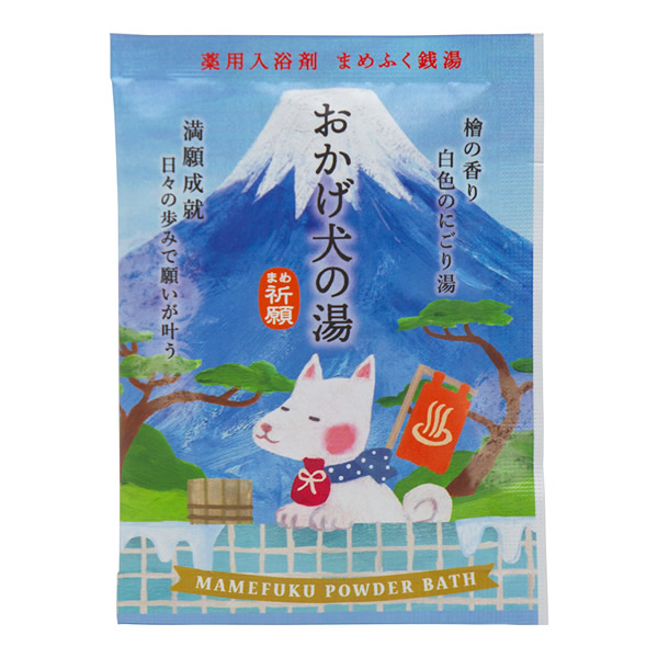 | 富士を背に湯につかる縁起物たちを描いた、パウダータイプの薬用入浴剤。 [効能] 疲労回復、神経痛、腰痛、冷え症、肩のこり [おかげ犬の湯(満願成就)] 日々の歩みで願いが叶う 江戸時代、ご主人の代わりに伊勢神宮を参詣したと言われる忠犬がモチーフ。 無事帰参したことから開運のご利益があると言われています。 檜の香り 白色のにごり湯 |