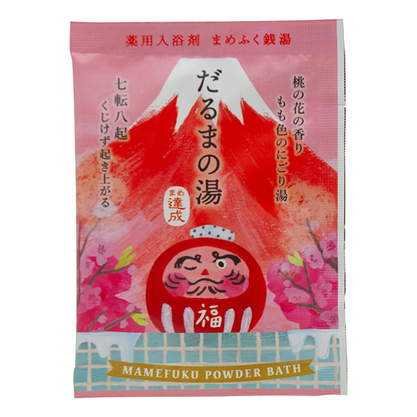 | 富士を背に湯につかる縁起物たちを描いた、パウダータイプの薬用入浴剤。 [効能] 疲労回復、神経痛、腰痛、冷え症、肩のこり [だるまの湯(七転八起)] くじけず起き上がる めったに倒れず倒れてもすぐ起き上がることから 「七転八起」の縁起物として親しまれてきました。 桃の花の香り もも色のにごり湯 |