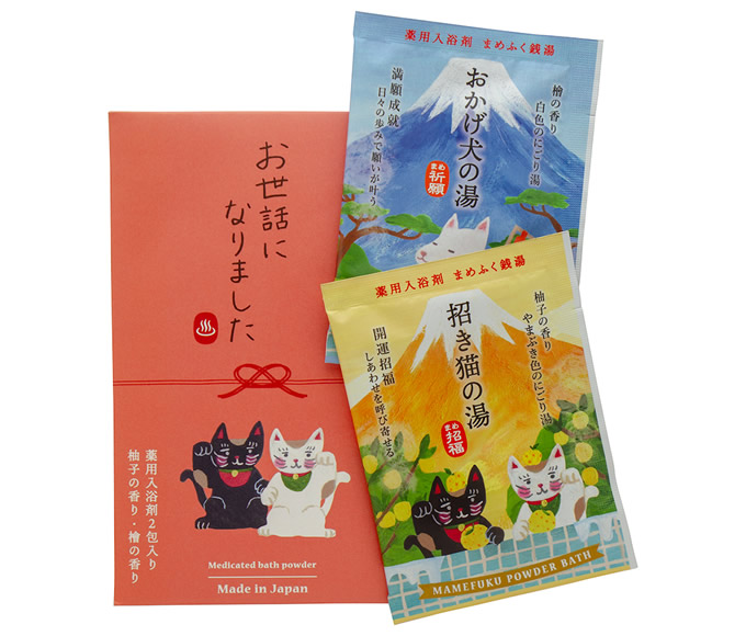 | まめふく銭湯が2包入った包み紙タイプのセット。 ご挨拶のメッセージ入りでギフトにおすすめです。 パッケージの内側には縁起物の豆知識が書かれています。 [効能] 疲労回復、神経痛、腰痛、冷え症、肩のこり [お世話になりました] 薬用入浴剤2包入り 柚子の香り・檜の香り |