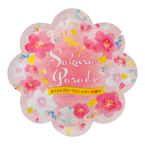 | お花のパッケージに入った春らしいパウダーバス。 満開のさくらと花々が描かれた、春の訪れを感じるバスシリーズです。 うるおい成分ハチミツエキス配合。 [さくら&フローラルシャボン] クリアピンクの湯色 |