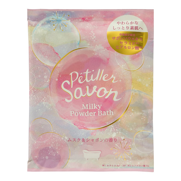 | シャボンの香りに包まれるミルキータイプのパウダーバス。 うるおい成分サボンソウエキス配合。 [ムスク&シャボンの香り] ミルキーピンクの湯色 保湿成分 セラミド・ヒアルロン酸 配合 |