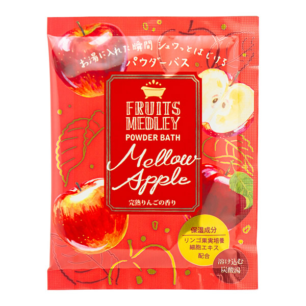 | 保湿成分ビタミンC配合のパウダーバス。 お湯に入れた瞬間、シュワっとはじけて香りが広がります。 [完熟りんごの香り] クリアイエローの湯色 保湿成分 リンゴ由来エキス(リンゴ果実培養細胞エキス・リンゴ果実エキス)、 ビタミンC(アスコルビルグルコシド)配合で いきいきとしたつややかな素肌へ。 |