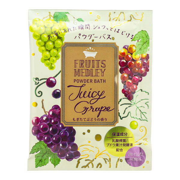 | 保湿成分ビタミンC配合のパウダーバス。 お湯に入れた瞬間、シュワっとはじけて香りが広がります。 [もぎたてぶどうの香り] クリアパープルの湯色 保湿成分 ブドウ由来成分(乳酸桿菌/ブドウ果汁発酵液・ブドウ種子油)、 ビタミンC(アスコルビルグルコシド)配合で、 ぷるんとハリのある素肌へ。 |