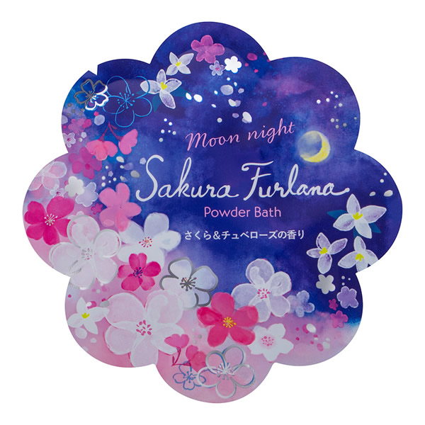 | お花型のパッケージに入ったうるおい成分ハチミツエキス配合のパウダーバス。 [さくら&チュベローズ(月下香)] クリアパープルの湯色 |