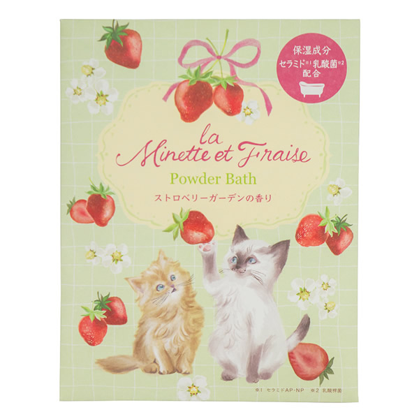 | いちごの香りを楽しむ 猫柄の紙封筒入パウダーバス。 保湿成分セラミド、乳酸菌、いちごエキス配合でしっとりしたうるおい肌へ。 ストロベリーガーデンの香り ベビーピンクの湯色 |