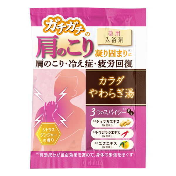 | 有効成分が温浴効果を高めて、身体の緊張をほぐします。 【効能・効果】 神経痛、あせも、荒れ性、うちみ、くじき、肩のこり、しっしん、しもやけ、痔、冷え症、腰痛、リウマチ、疲労回復、ひび、あかぎれ、産前産後の冷え症、にきび [ガチガチ(シトラスジンジャー)] ガチガチの肩のこり 凝り固まりに 3つのスパイシー配合(保湿成分) ショウガエキス・トウガラシエキス・ユズエキス |