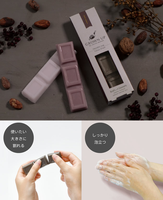 | 手に取りやすく、ちょっとしたプレゼントに嬉しいチョコレート型の石鹸。 天然由来の保湿成分配合とスクラブ成分配合で毛穴の奥まですっきり。 6種の天然由来の保湿成分配合:クコ果実エキス、シアバター(シア脂)、カカオバター(カカオ脂)、ホホバ種子油、アルガンオイル(アルガニアスピノサ核油)、加水分解コラーゲン スクラブ成分配合:モンモリロナイト [シトラスフルーツ] 甘みと酸味のあるシトラスフルーツの香り |