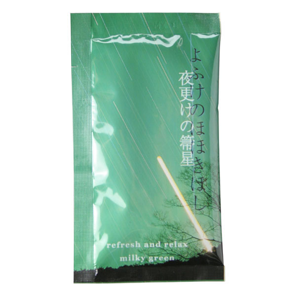 | 自然・宇宙のエネルギーをテーマに、安らぎと希望のメッセージを込めました。 高分子(なめらか成分)配合によるやわらかなお湯が体をやさしく包み、香り、色とともに幻想的な空間を演出します。 [夜更けの箒星] 夢をイメージした優しい香り。 ミルキーグリーンの色彩が有機を与えてくれます。 オウバクエキス・ユズエキス・米ヌカエキス(保湿成分)。 |
