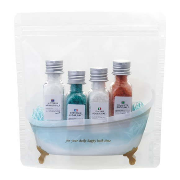 | 白いバスタブ柄がかわいいジッパーバッグに、 バスアイテムを詰めました。 ちょっとしたギフトにもどうぞ。 [バスソルト] バスソルトが入った小さなボトルを詰めました。 4か国のバスソルトが入っています。 |